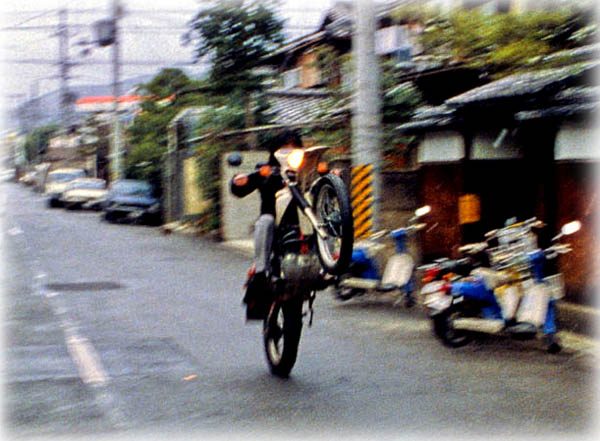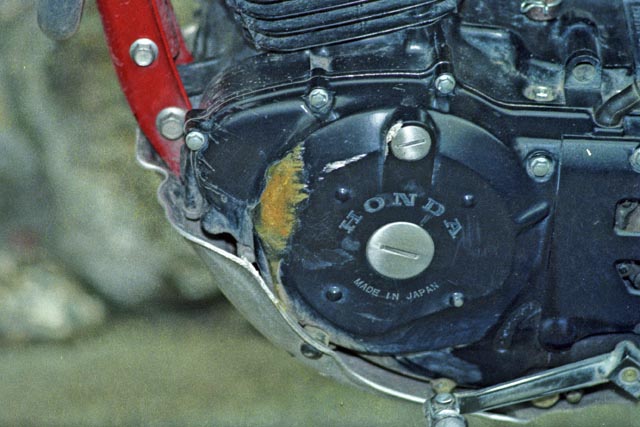 | 雨の日にスリップして、縁石にクランクケースをぶつけてしまいました。 幸い、コケなかったのですがクランクケースカバーが裂けるように割れてしまいました。 エンジンを吹かすとエンジンオイルがぴゅ〜っと吹き出ました。 家まで100kmぐらい離れた場所で、さて、どうしよう? すぐ近くに文房具屋さんがあり、2液混合型エポキシ接着剤を購入。バイクを倒して、 裂け目に塗り塗り。無事、家まで帰れました。 早速、交換のために部品を発注。 でも、このままで数万kmも保ってしまい、結局、 バイクを手放すまで、エポキシ接着剤で修理したままにしてしまいました。 |