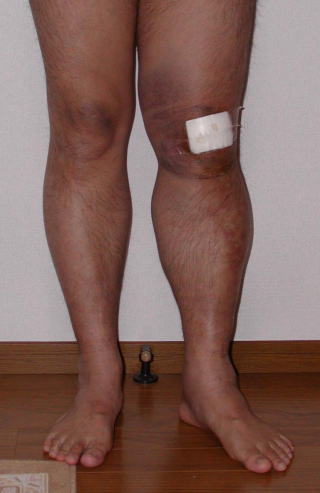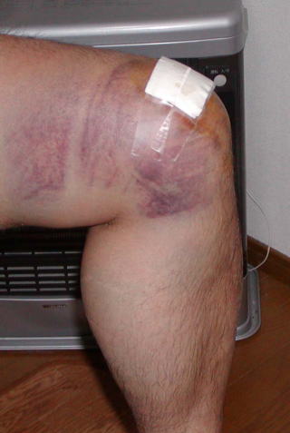 左足の膝から落下したため、ご覧のように左足のふともも、ふくらはぎが