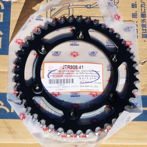 | 黒いのが新しいスプロケ(JT Sprockets社のJTR808 41T)。 その下に銀色の43Tのスプロケが置いてあります。 なお、このホイールは前期型のハブダンパーが無いもので スプロケがハブに直接ネジ止めされるものです。 後期型のハブダンパーがある場合は上のスプロケは取り付け られないので気を付けて下さい。ハブダンパーがある場合は こちらを参照して下さい。 |