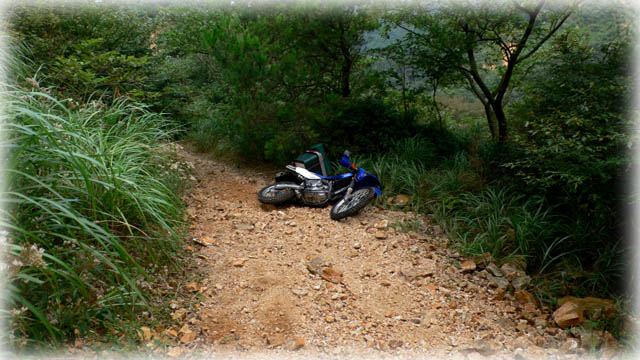 ガレガレの登り坂で、バイクが前に進まなくなって立ちゴケ。