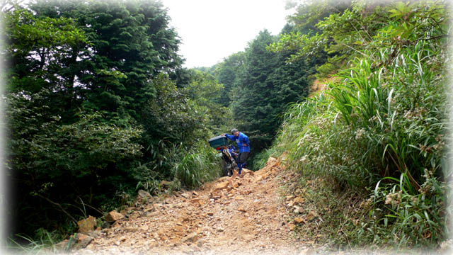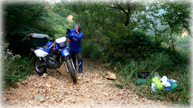 下ることに。200mほど下って、安全な所にバイクを停め、徒歩で坂を登り、