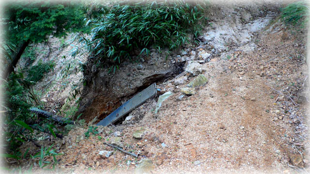 (写真中央の排水溝のフタが流されて落下しかけています。おそらく7月の長雨の後遺症でしょう)
