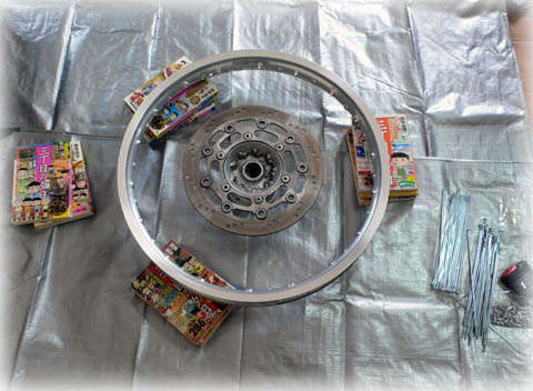 これでは実用にすることはできませんので、リムとスポークを新品に交換することに