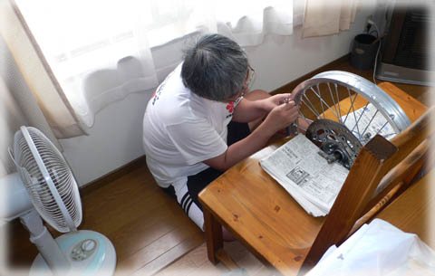 落ち着いて作業するために部屋に持って入って、新しいリムを置いてみたところ。