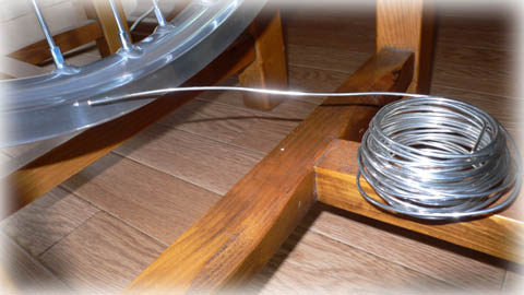 こんな具合に、針金をリムの付近に置いて基準点を設け、振れ具合を見ました。