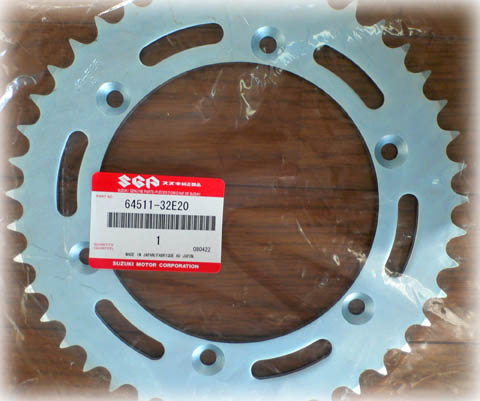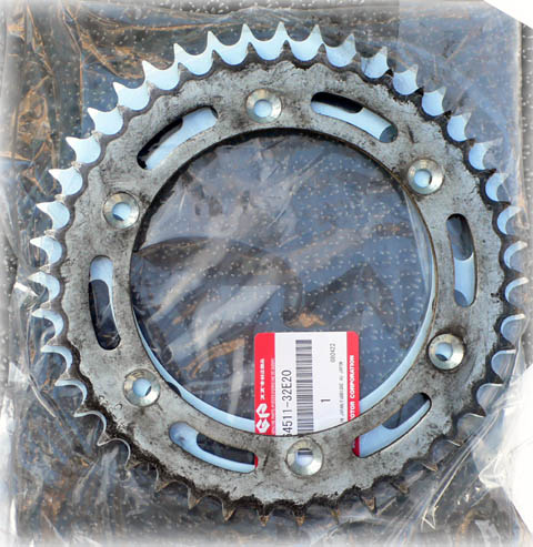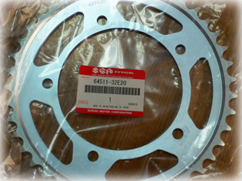 | そこで、部品番号 64511-32E20 で注文してみました。 確かに43tなんですが、取り付け穴が5個しか空いていません。 これではDR650に取り付けられません。 |