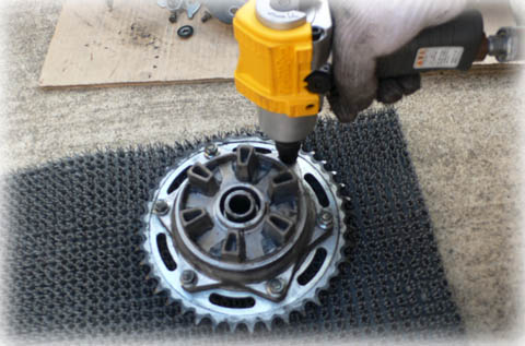 | ネジはしっかりと締め付けられています。 丸っこいので、メガネレンチをかけても本体側を固定しにくいのです。 そこで、伝家の宝刀の登場です。、エアインパクトレンチでバリバリッと緩めてしまいました。 ラクチン、ラクチン。 |