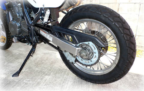 | DR650SE リアスプロケット交換 (2008年6月12日) DR650オーナーズ友の会(DOT-N)では、DRの41tのスプロケットは あまりにもハイギアードなので、XF650純正の43tのスプロケットに 交換するのが定石となっています。 41tでは5速トップギアには80km/hぐらいの速度にならないと入れられないのです。 |
