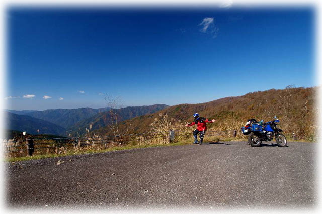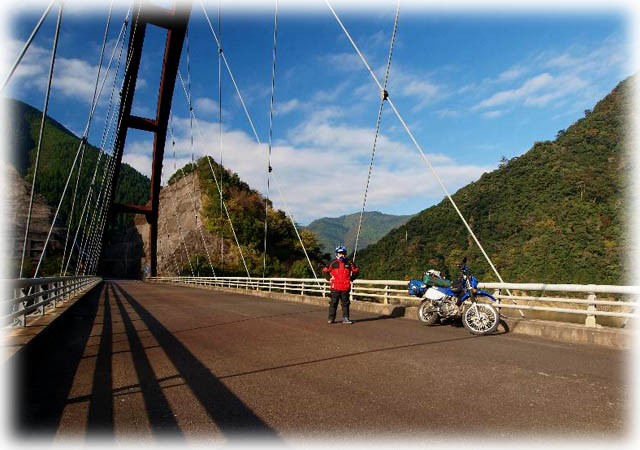 | 椎葉村を目指します。 写真は快走路ですが、ほとんどが見通しの悪い1車線しかない酷道でした。 1車線の左ブラインドコーナーを抜けると目の前を斜めに横切る 30~40cm長の4つの物体。フルブレーキングして前後タイヤは ロック気味。前輪まであと10cmぐらい、というギリギリのところで、 4つの物体は散り散りに逃げて行きました。体の模様とずんぐり した形から「ウリ坊」のようでした。野生の猪って初めて見ました。 ウリ坊が母親に言いつけたら恐いので、とっとと私も去って行くことに しました。 |