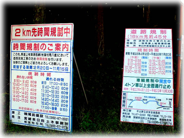 | いよいよ椎葉林道ですが、この看板。10km先が通行止めと。 バイクだったら通れるか? しかし引き返すことになればショックですので、 椎葉林道はあきらめることにします。少し南下して西へ向かいます。 |