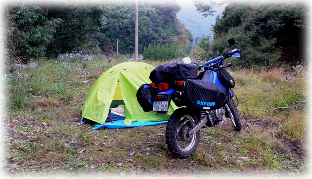 | 今日のねぐら 国道443号線から県道155号線へ分岐した辺りです。 もう10kmほどで九州自動車道の八代ICです。 テントを張っていると、中型犬(柴犬よりはだいぶデカイ)が突然 やって来て、馴れ馴れしくします。首輪が付いていたので「早く、 家に帰れ」と言うと、去って行きました。あ~、びっくりした。 凶暴な犬でなくて良かったです。 |