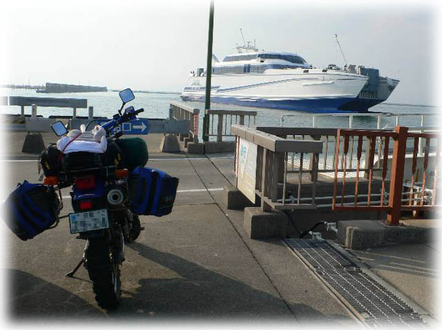 | 乗船を待っているところ。私が先頭、すぐ後ろはハーレー。 長崎でハーレーの集いがあったそうです。 ナンバーを見ると同じ「京都」。彼は京都の日本海側に帰るんだそうです。 |
