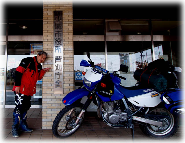 | 以前は小城郡芦刈町だったのですが平成の大合併で小城市になりました。分庁舎の玄関前にて。 今日は土曜日なので誰もおらず玄関前にバイクを置いて撮影できました。 |