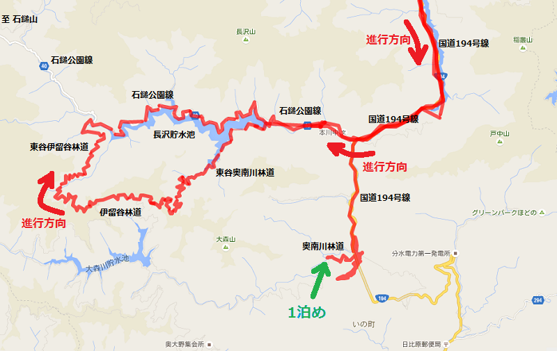 | 東谷奥南川林道 → 伊留谷林道 → 東谷伊留谷林道 と時計回りに走り、 再び県道40号線(石鎚公園線)に戻り、国道194号線に戻り、北上します。 |