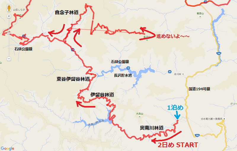 | 分岐を間違えて、県道40号線(石鎚公園線)に戻ってしまいました。 引き返すと、さっきのクレーン車のところを通らねばなりません。 それではまた迷惑をかけるのでルート変更。別の林道に入ることにしました。 県道40号線の北側にある自念子林道です。 地図には通行止めになっていますが、バイクなら通り抜けられるかも しれないので行ってみることにしました。 |
