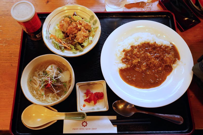 | 国道194号線沿いにある道の駅「木の香」(このか)で温泉に浸かり (長湯はしませんが、こわばった筋肉をよく揉んでおきました)、 ちょっと早い(16時半)夕食です。 この食事が、今回の旅で一番豪華なものでした。 「きじカレー」と「きじラーメン」の「きじ唐揚げサラダ?」のセット。 |