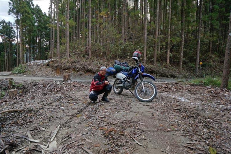 | 翌朝、反対方向から撮ってみました。すぐ先は行き止まりです。 夜は思ったほど寒くありませんでしたが、バイクが夜露でびしょ濡れでした。 バッグは雨天時の防水カバーをかけておいて正解でした。 テントを撤収していると、林道の奥で伐採作業をするために軽トラで出勤(?)する人たち から、いっぱい声をかけられました。今日は平日ですからね〜 「ここで泊まったの?」 とか 「寒かった?」 とか。 |
