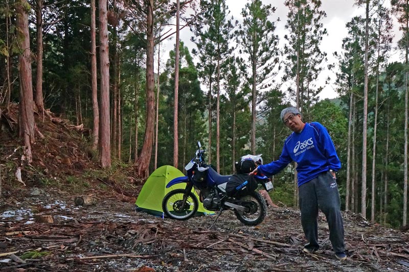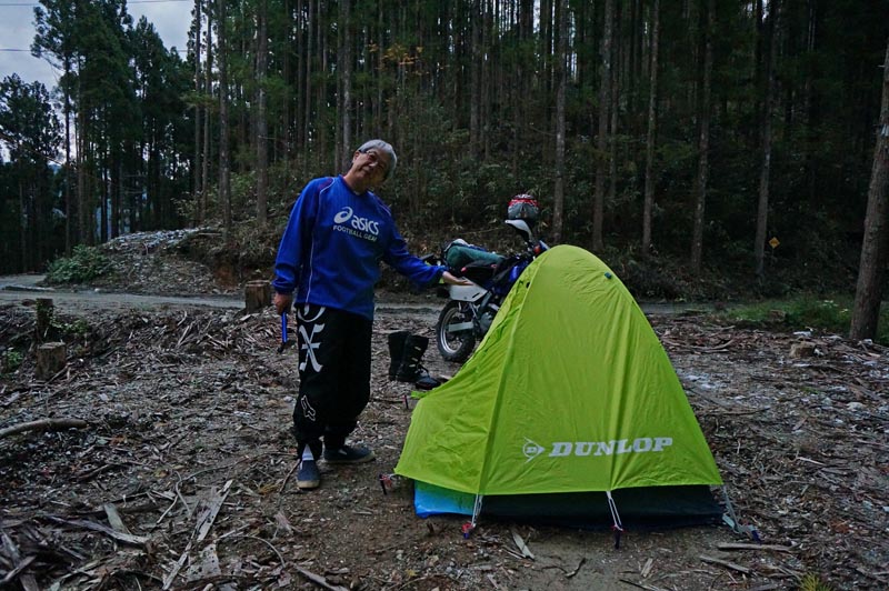 | 国道195号線も香美市付近は都会で人家が多く、テントが張れません。 30kmほど走り、やっと人家が見えなくなりました。 トンネルの脇の道にテントを張ります。 |