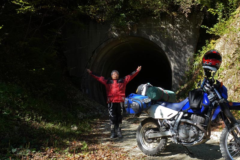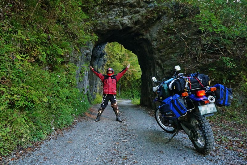 | 朝、起きると、そこはすぐに林道です。嬉しいな〜 素掘りのトンネルが怪しさ爆発です。 |