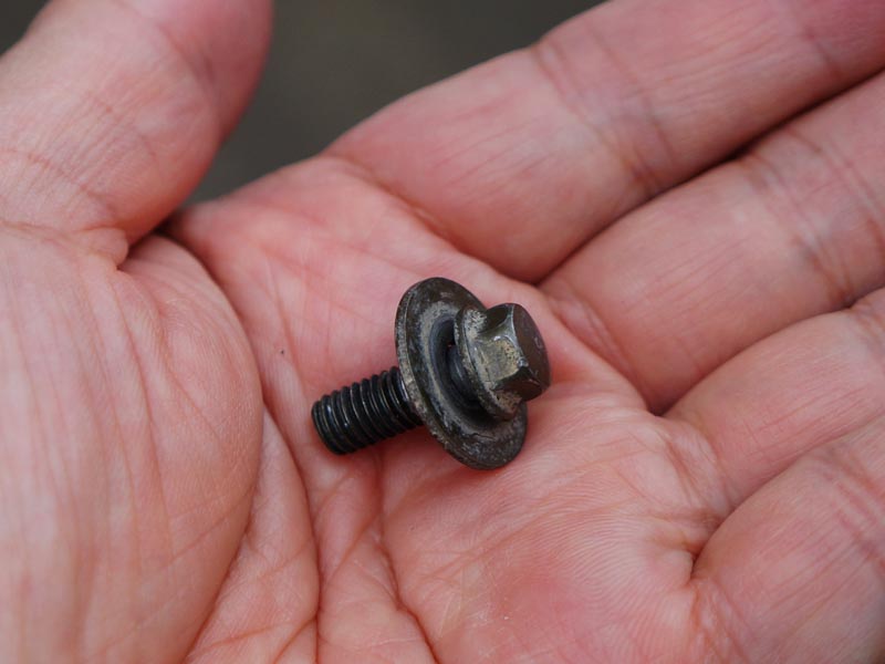 | これがフェンダーを止めているネジ。 M6のくせに、頭の二面幅は8mmという、不思議なネジです (家に帰ってから気がついた。頭の二面幅が8mmならM5だと思っていた)。 |