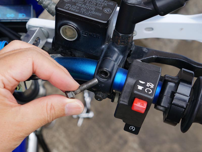 テントの中で寝ていると、深夜、ゴトン、ゴトンと大きめ石(岩)がぶつかり合うような音が 時々します。付近に人家はなく、てっきりクマかイノシシが崖を上り下りする際に石を 蹴散らしているのかと思い、テントの中で大声で歌を歌ってました。 朝、起きて、後片付けをして、出発。うん、フロント・フェンダーが曲がっているぞ。 コケたわけでもないのに、なぜ?? すぐにバイクを停め、フェンダーを触ると、、、 グラグラになっています。フェンダーを取り付けてあるネジが4個のうち3個が脱落してました。 最後の1個もゆるゆるになっていて、もう少しでフェンダーが外れてしまうところでした。 最後の1個をきつめに締め込んでみましたが、オフロードバイクのフェンダーは 長く、振動でブラブラしてしまいます。これでは舗装路でさえも走れません。 バイクをジロジロと見て、使えそうで、かつ外しても問題なさそうなネジを探すと、、、 オイルクーラーを保護する網の取り付けネジは長さが短く使えません。 フロントブレーキレバーのホルダーを固定するネジは1本拝借できそうです。 やってみると、何とか大丈夫そうです。 |