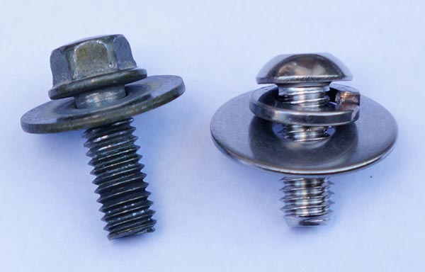 | フロントフェンダーを固定するネジは後日、スプリングワッシャを入れて 緩まないようにしておきました。 左: 純正のネジ(高さ4.7mm) 右: 六角穴つきナベ頭ネジ(高さ3mm)+スプリングワッシャ(1.2mm) |