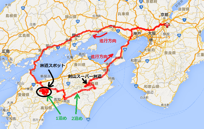| 初日、朝7時に出発。高速道路で大阪→兵庫→岡山→広島を抜け、 しまなみ海道で愛媛県今治市へ上陸。 今治市から南東方向、西条市へ。西条市から国道194号線を南下。 寒風山トンネルを抜けて、西側の長沢貯水池方面に向います。 この貯水池の辺りはオフロード林道の宝庫なのです。 長沢貯水池の周りの林道をぐるりと巡り、ここで1泊。 2日めも貯水池付近のオフロードを堪能し、県道40号線(石鎚公園線)で瓶ヶ森へ。 再び国道194号線に出て南下。早明浦ダムを経て、東方向にある剣山方面に向かいます。 国道195号線を東進。トンネル脇で2泊め。 3日めは、国道195号線をさらに東進。剣山スーパー林道を目指します。 現在、スーパー林道は通行止め区間が多く、一部分しか走れません。 それでも30kmぐらいは走れました。 国道438号線に出て東進。徳島市から、高速道路で一気に帰宅。17時。 |