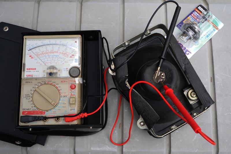| ライトユニットを外してみるとハイビームの抵抗値が∞。球切れです。 |