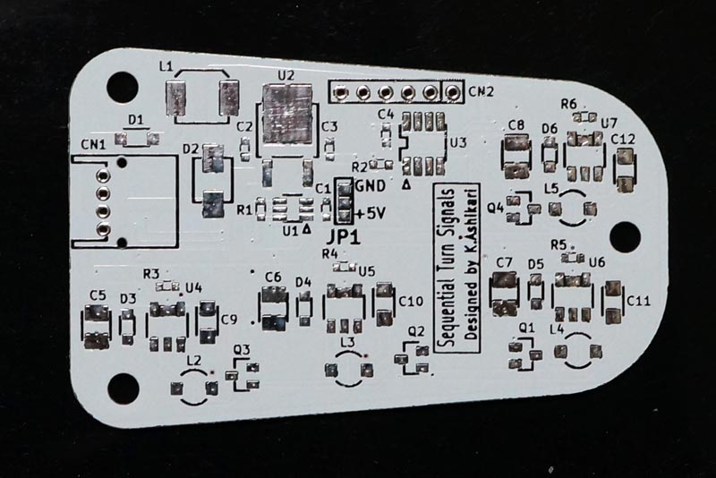 | DR650のウィンカーボディにすっぽり収まるような形の基板を作りました。 これは裏側(光らない面)です。 |