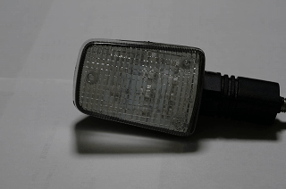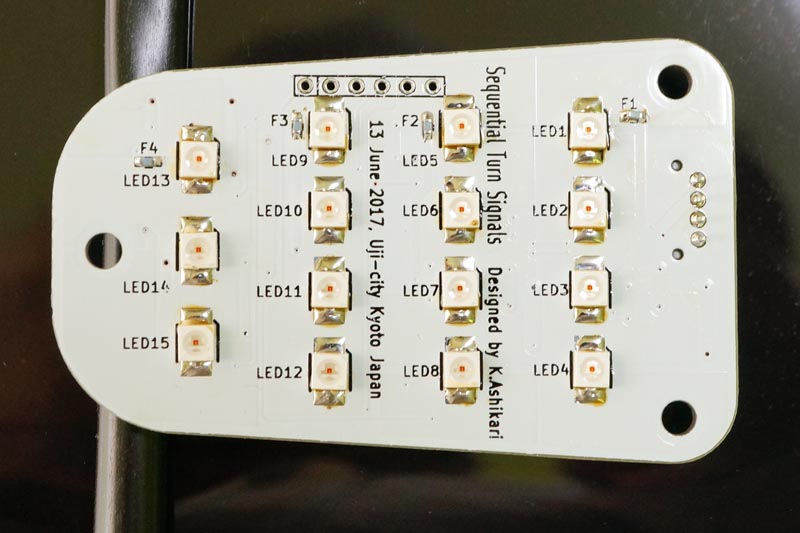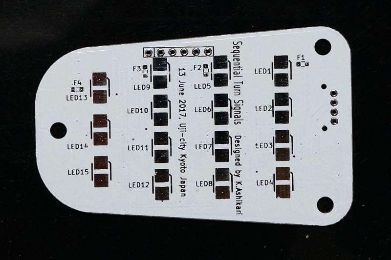 | この面が光ります。 光を反射するようにレジストは白色にしました。 全面にLEDが付きます。あと、安全のためFUSEを1列毎に入れてあります。 テールランプのLED化とほぼ同じ回路ですが、ウィンカーボディの形状のため、 左端の列だけLEDが3個になっています(他の3列は4個)。 全部で15個のLEDが付きます。 |