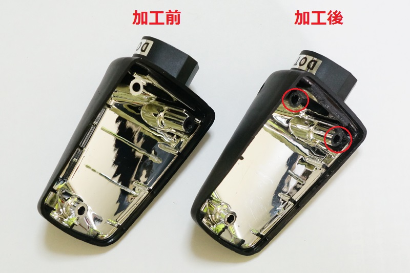 | ウィンカーボディをウィンカーレンズを接続するネジの支柱部分も削ります。 ウィンカーレンズ側のネジの支柱部分も削りました。 |