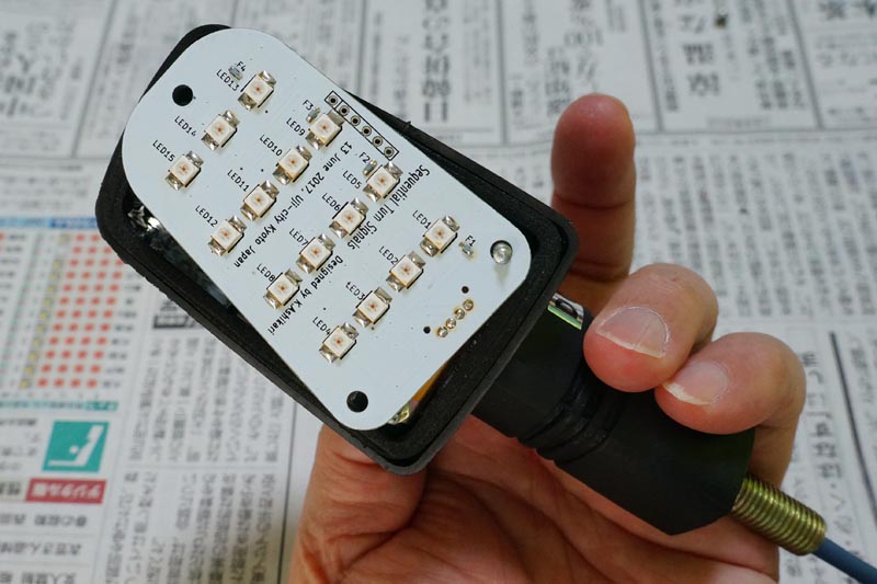 1分間に70回の周期 が良さそうでした。 これはコントローラ側でコマンド送出後の待ち時間を変えることで変更できます。 4個のウィンカーは、コントローラの指示にただ従うだけです。 全て動いたので、さあ、車体に取り付けましょう。 |