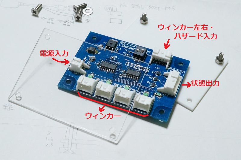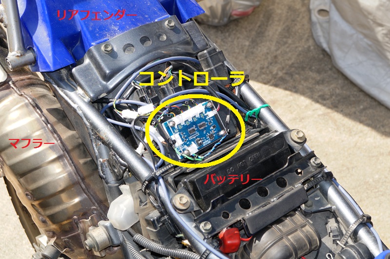 | コントローラの上下にアクリル板を付けて保護しておきます。 全く防水ではありません。 シート下のCDIユニットの上に両面テープで固定します。 上側のアクリル板は透明にしてみました(白いと基板が見えなくてさびしいので)。 |
