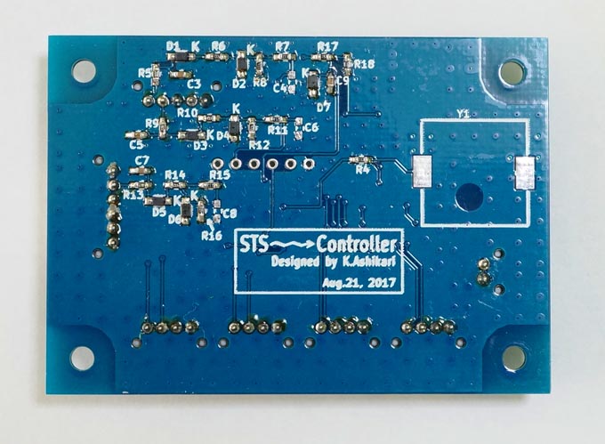 | これが裏側です。シルク印刷がややボケています。 写真を撮る時に手ブレしたのではありません。 "Made in China"の品質ですね。 5枚で US $5 という安さなのでしょうがないです。 パターンの途切れやショートはなく、実用上の問題はありません。 この面は、ウィンカーSW(Lerf/Right)、ハザードSWの入力回路(3入力)です。 誤動作しないように割と厳重にフィルタリングしています。 |