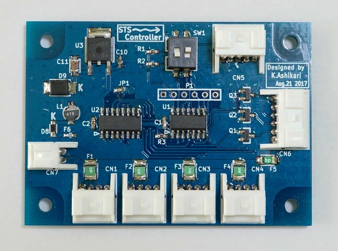 | これは4個のウィンカーを制御するユニットです。ウィンカーリレーに相当するものですが 「リレー」と言うには複雑過ぎるものですので「コントローラ」と言うべきですね。 コネクタだらけです。 基板は70mm×50mmの大きさです。 中央のU1がマイコン(ATTiny441)です。 その左側のU2はRS-422のトランスミッター(4ch)です。 4chありますが、トランスミッターの入力4線は接続されていて 4ch別々にコマンドが送出されるわけではありません。 同時に同じコマンドが4つに分かれて送出されます。 4個のウィンカーユニットは全く同じコマンドを受信します。 ウィンカーが受け取るコマンドは 1. 1列だけLEDを点灯させる。 2. 2列のLEDを点灯させる。 3. 3列のLEDを点灯させる。 4. 4列のLEDを点灯させる(フル発光)。 5. LEDを全て消灯させる。 6. 4列のLEDを20%の光量で点灯させる。 7. 自己認識させる。 があります。 この7種類のコマンドを4個のウィンカーに送信します。 7種類のコマンドをコントローラから4個のウィンカーに送信することで、 「流れるウィンカー」の動作の他に、 「ハザード動作」・「前側2個のウィンカーを車幅灯として動作」 できます。 また、個々のウィンカーユニットが「前の左」・「前の右」・「後ろの左」・「後ろの右」の どれであるかを認識させる機能があります。 コントローラのコマンドは4個のワインカーに一斉送信しますので、 個々のウィンカーは自分用のコマンドなのか、そうでないかを把握しています。 自分用のコマンドでない時は無視して何もしません。 例えば、左側にウィンカーを出す時は 1. 「前の左」・「前の右」・「後ろの左」・「後ろの右」 は全消灯しろ 2. 「前の左」・「後ろの左」の1列を点灯しろ 3. 「前の左」・「後ろの左」の2列を点灯しろ 4. 「前の左」・「後ろの左」の3列を点灯しろ 5. 「前の左」・「後ろの左」の4列を点灯しろ 6. 2.に戻る という風にコマンドを出します。 (コマンドは常に4個のウィンカーユニットが受信しています)。 |
