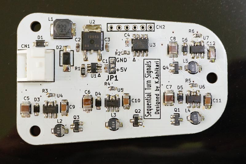 2017年の6月頃から設計、基板を作り始め、お盆の頃にはウィンカー部・コントローラ部が できあがり、さあ、双方を繋いで動作確認のための配線をしようと思ったら、、、 コネクタの圧着がうまくできません。 コントローラはコネクタだらけになるので、コントローラ基板を小さくするために コネクタのピッチ1mmの超小型のコネクタ(JSTのNSHコネクタ)を採用したのが失敗でした。 ピッチ2mmのコネクタ(JSTのPAコネクタ)に変更し、基板を作り直しました。 そうこうしているうちに秋がやって来て、ツーリングに出かけたり、DR-Z400の ジェネレータが壊れて修理したりしているうちに冬が来てしまいました。 やっと春が来て、再開しました。 結局、ほぼ1年間の気の長い開発となりました。 【消費電力の計算】 ウィンカー動作時は以下のとおり。