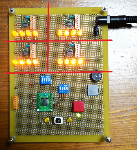 | 試作・実験回路です。上側にウィンカー4回路、下側がコントローラです。 全部でマイコンが5個載っています。 RS422インターフェースは無く、マイコン同士を直結しています。 |
