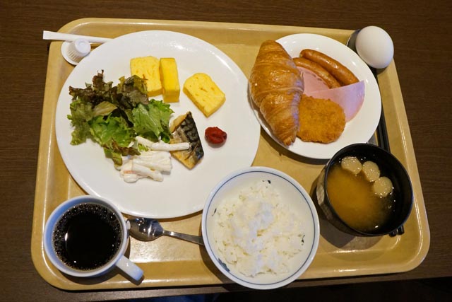 | 朝食。 バイキング形式なので、ご飯もパンも食べる。 |