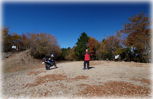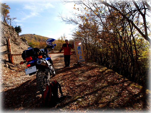 | 護摩壇山の駐車場はバイクとクルマでいっぱい。 スカイタワーの後ろをかすめて林道へ。 でも1kmほど行くとこの通り。 またまた引き返すことに。 |