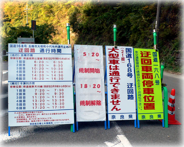 | 国道168号線を北上していると通行止め! げげげ。 迂回路に誘導されます。 現在14:40。北行は次回16:20にならないと通ることができません。 ひえ〜、1時間40分も待たないとなりません。 地図で調べると、別のルートとして国道168号線をもう一度南下して、 国道425号線を東に行き、国道169号線を北上するしかありません。 国道168号線と国道169号線の間の国道425号線はまさしく酷道です。 今年の6月に家内とタンデムして通ったことがあります。 国道425号線だけで軽く1時間以上かかります。南下した分も入れると 2時間以上、もしかしたら3時間ぐらいかかりそうです。 しかたないので、ここで待つことにします。 ヒマなので、ホコリまみれのチェーンをウェスで拭き、チェーンオイルを くれてやりました。丁寧にやって30分ぐらいは気が紛れました。 迂回路から元の国道168号線に戻ると16時半をまわっていました。 あ〜、暗くなる〜 飛ばしに飛ばして五條市〜柏原市〜奈良市を抜けて家に辿り着きました。 最後の木津川市〜城陽市は京奈自動車道に乗りました。 3連休の真ん中、いい天気のために市街地は大渋滞でした。 ふ〜〜〜 |