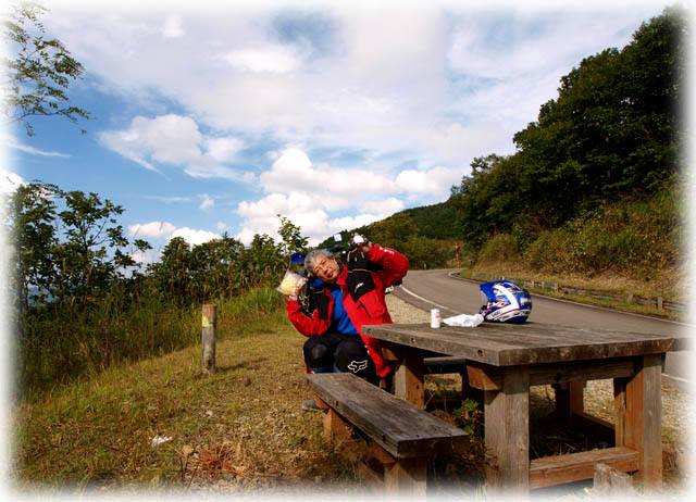 | 瀞川氷ノ山林道を抜けたところで、遅い昼ご飯。 いつものようにおにぎりとメロンパン。 |