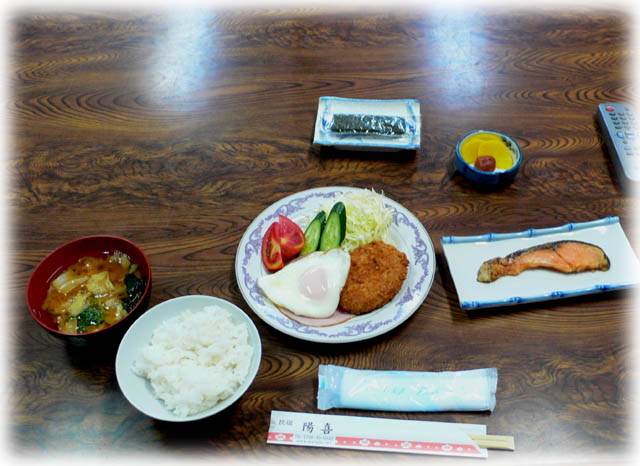 | これは朝御飯。 晩御飯もそうでしたが、炊き立てのご飯をジャーごとドンと置いてあるので つい食べ過ぎてしまいました。 |