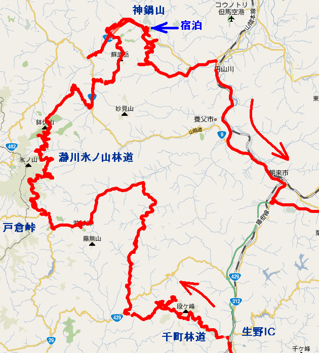 | 1日目 朝7時出発。中国縦貫道・福崎ICから播但連絡道・生野ICで降りました。 宝塚の辺りが混んでいて1時間半ぐらいかかりました。 生野高原の林道を抜け、R29戸倉峠の南付近から瀞川氷ノ山林道を通って鉢伏高原へ。 この林道はかなり長くたぶん20km以上あると思われます。ななかな走りごたえがありました。 最後は妙見蘇武林道から神鍋へ。この林道はかなり険しかったです。 神鍋山のすぐ近くの民宿「陽喜」で宿泊。 2日目 神鍋山の火口を1周し、名色羽尻林道を抜けてオフロードはおしまい。 北近畿豊岡自動車道・舞鶴若狭自動車道・中国縦貫道を通って帰宅。 |