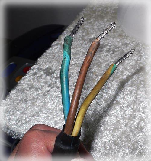 | TIG溶接機のAC入力ケーブル。 何だか薄汚れています。 長さも2mしか付いてなくて短いので5mのケーブルに繋ぎ換えることにします。 最大28Aの電流が流れますのでVCTの3.5SQにします(単相200Vです)。 |