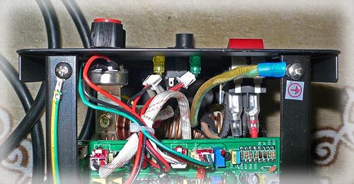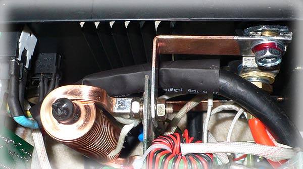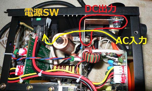 | 次は側面です。 AC入力ケーブルが電源SWに繋がっていますが途中、ACケーブルがDC出力端子に触れています。 DC出力には最大200Aの電流が流れます。 銅板で出力端子に接続されているのは良いのですが、ACラインに触れているのはマズいでしょう。 熱で被覆が溶けてショートする可能性があります。 |