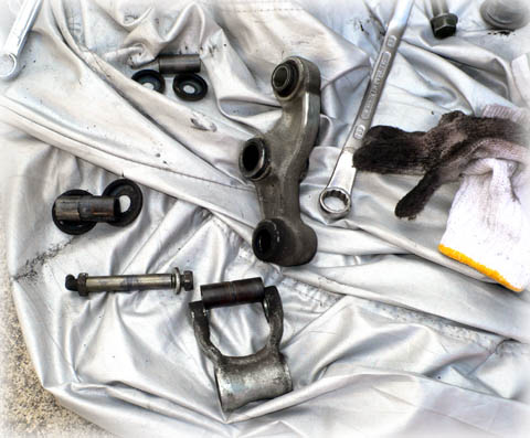 スイングアームに取り付けられている、サスペンションのリンクをバラしているところ。