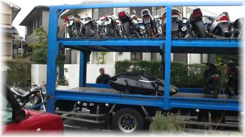 | VX800がトラック便で運ばれてきました。 (2007/3/3) 写真のの左端がVX800です。 運送屋のお兄さんがテキパキと降ろしていきました。 |