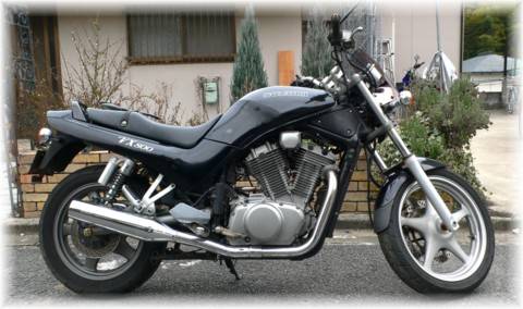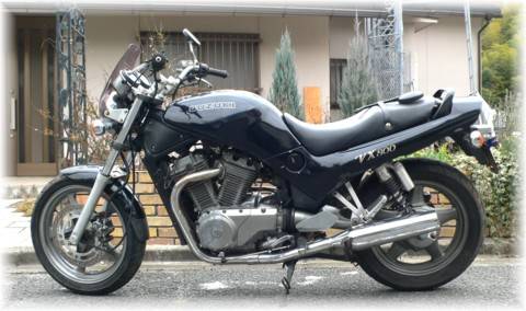 | Suzuki VX800 ってご存じ? 1990年に発売されたバイクです。 アメリカンタイプのイントルーダー(750cc)のエンジンのボアを3mm大きくして 805ccとしたものです。 フレームはイントルーダのものを流用しているそうですが、ステップ位置を後ろに リンクでズラし「普通の」ロードバイクになっています。 代表的なスペックを下記に書きます。 |