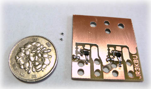 | 少し部品を載せました。 100円玉と基板の間にゴミのようなものがチップ抵抗です。1.6mm×0.8mm。 ピンセットでつまんで半田付けしました。 |