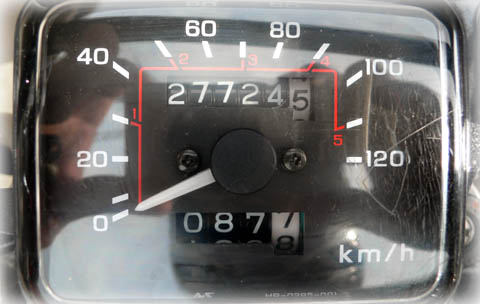 | これは家に帰ったところ。 フェリー乗り場ではトリップは12kmだったので、本日の走行は 75km。飲まず喰わずで2時間でした(行きの電車は2時間半)。 あまり暑くなくて良かったです。 27649kmで受け取ったことになります。 |